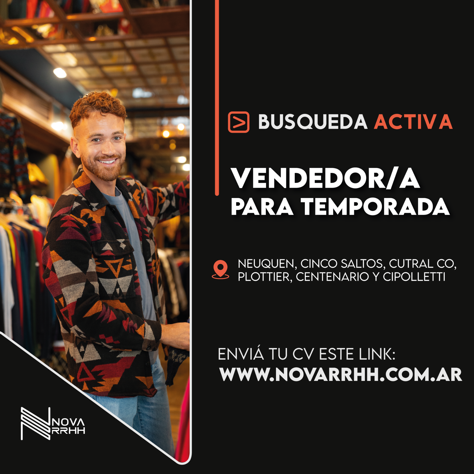 🔰 Nos encontramos en la búsqueda de vendedores/as de temporada para las fiestas en importante cadena de indumentaria ubicados en Neuquén y zonas aledañas.